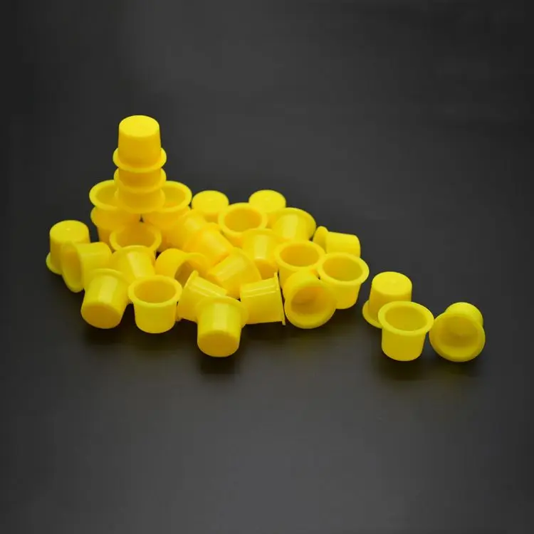 Жовті пластикові тату-ковпачки з конусним дном – зручні, стійкі та сумісні з підставками. Ідеальні для пігментів і фарб. Міцні та довговічні, вони зберігають чистоту робочого місця й підкреслюють професіоналізм студії.