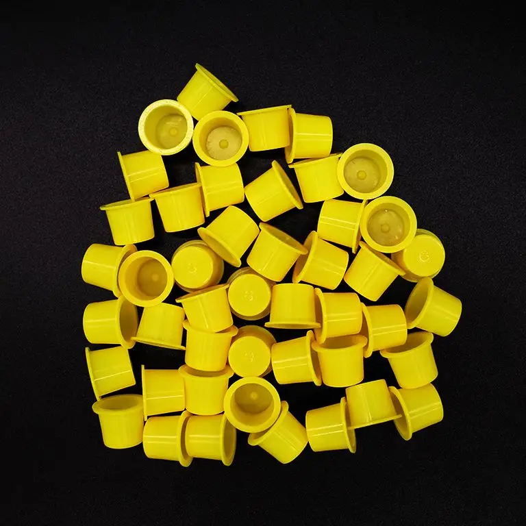 Желтые пластиковые тату-колпачки с конусным дном – удобные, стойкие и совместимые с подставками. Идеальны для пигментов и красок. Крепкие и долговечные, сохраняют чистоту рабочего места и подчеркивают профессионализм студии.