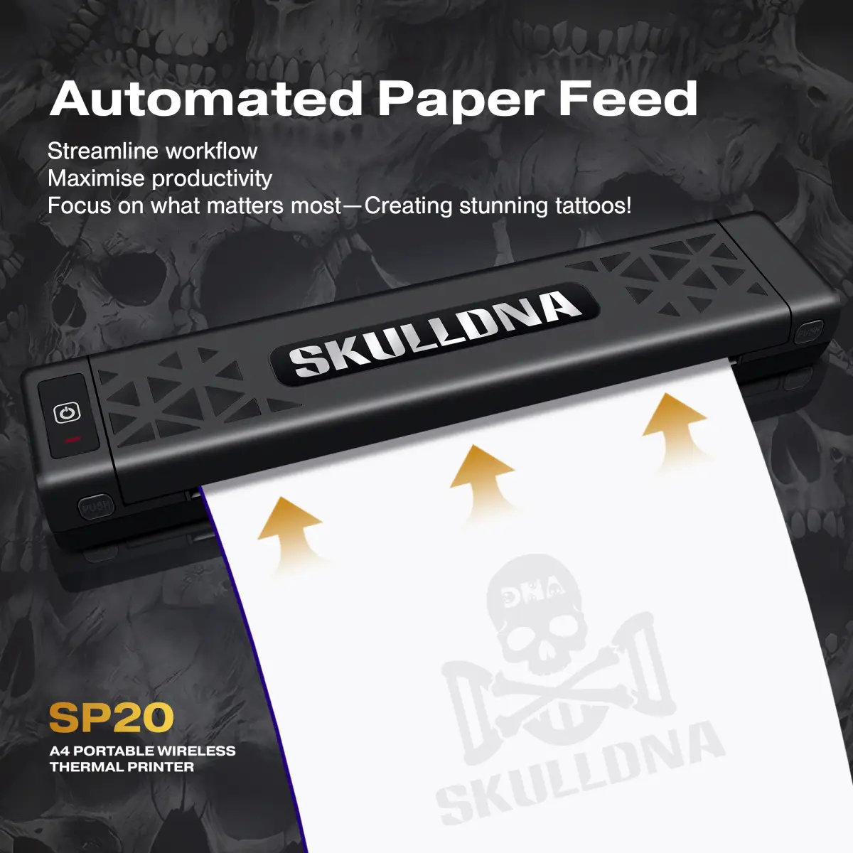 AVA Skulldna SP20 – компактный беспроводной тату-принтер (915 г), печатающий со скоростью 15 мм/сек при 203 DPI. Bluetooth, автоподача бумаги и зеркальное отображение эскизов. Идеальный выбор для мастеров и студий, ценящих скорость и точность.