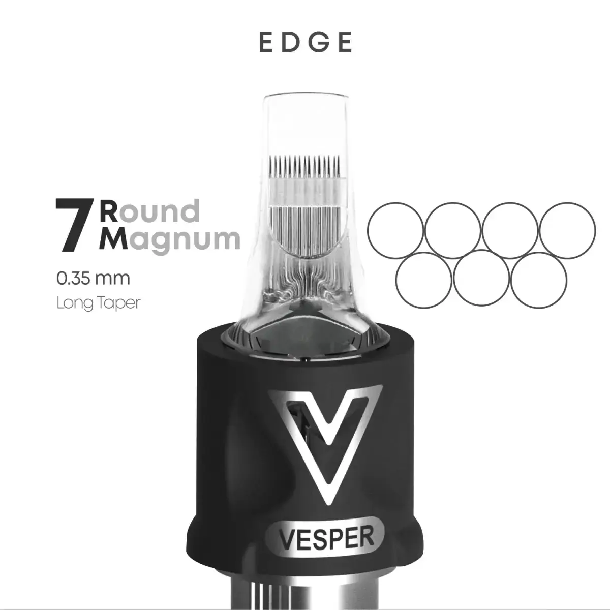 7 Round Magnum 0.35 Long Taper Картридж VESPER EDGE 7RM 0.35 мм Long Taper забезпечує більш насичену подачу пігменту та стабільний прокрас.
